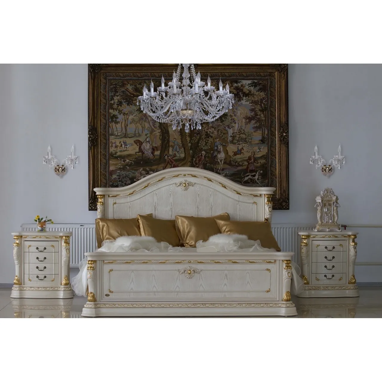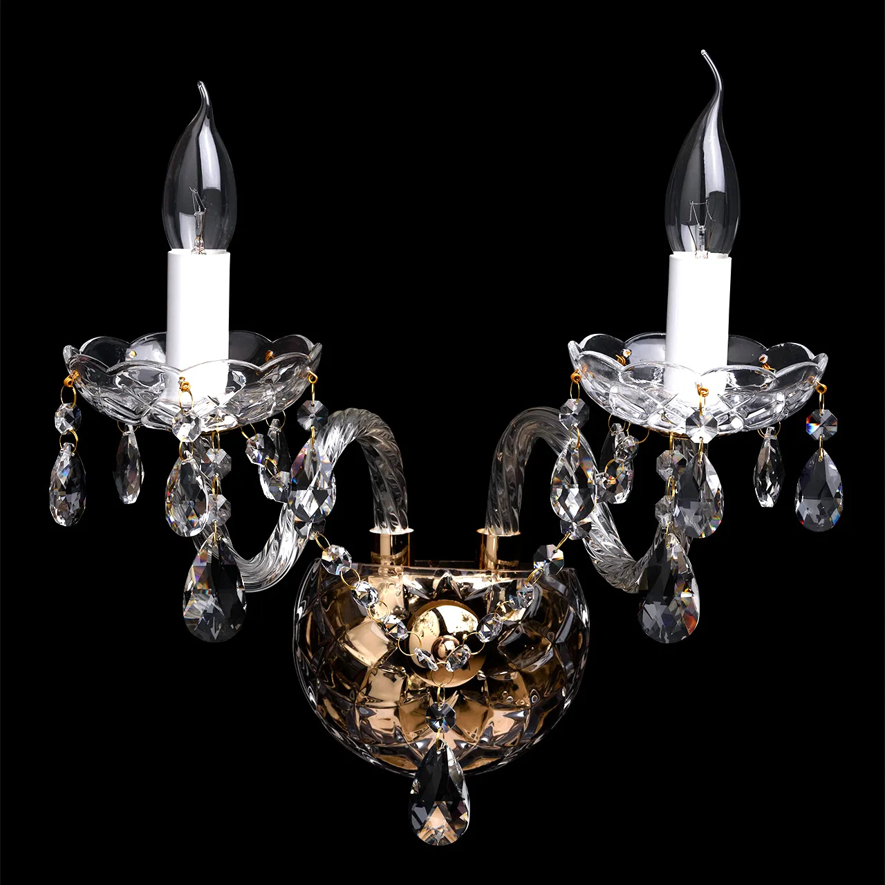 Металлическое основание цвета золота, декоративные элементы из прозрачного хрусталя и стекла с резн