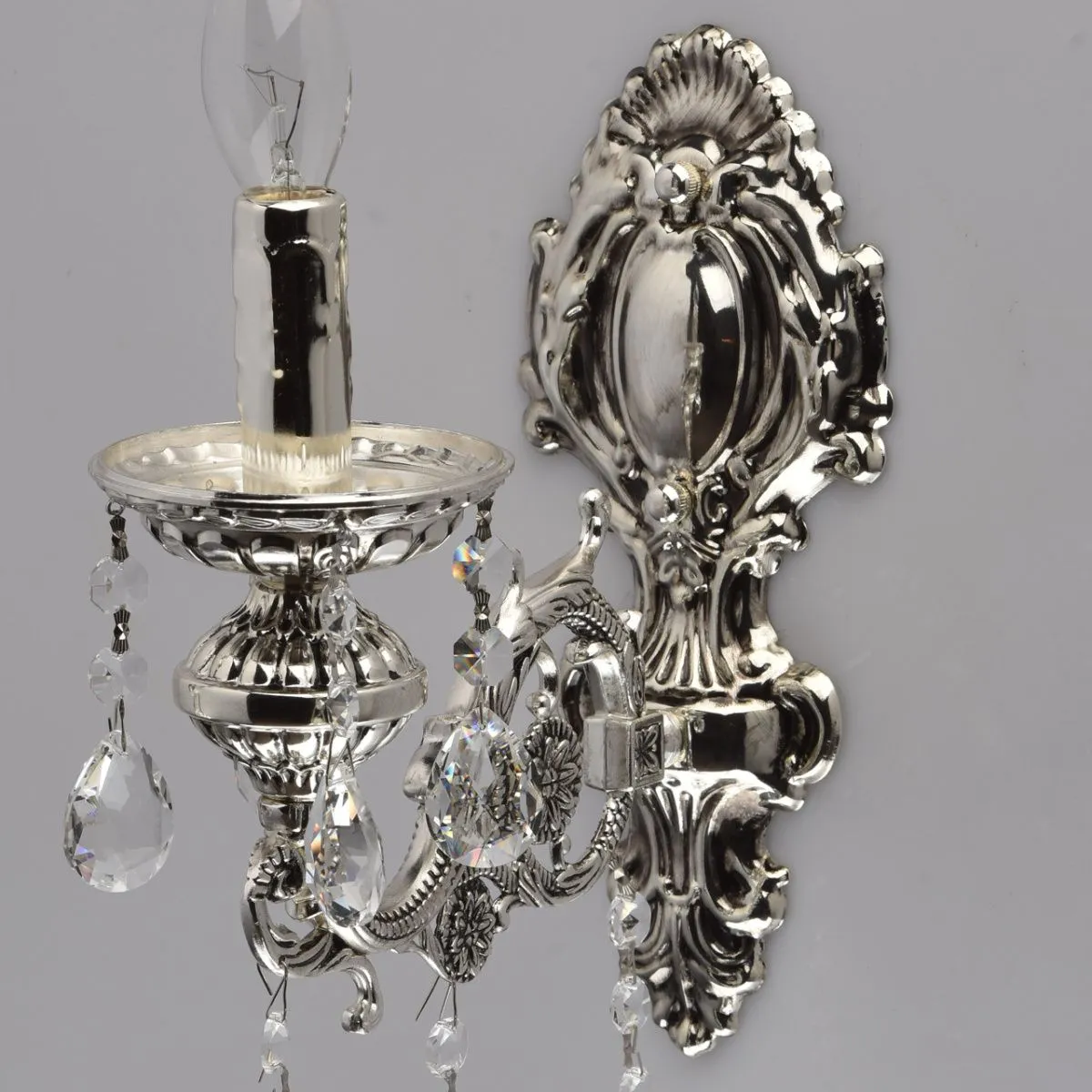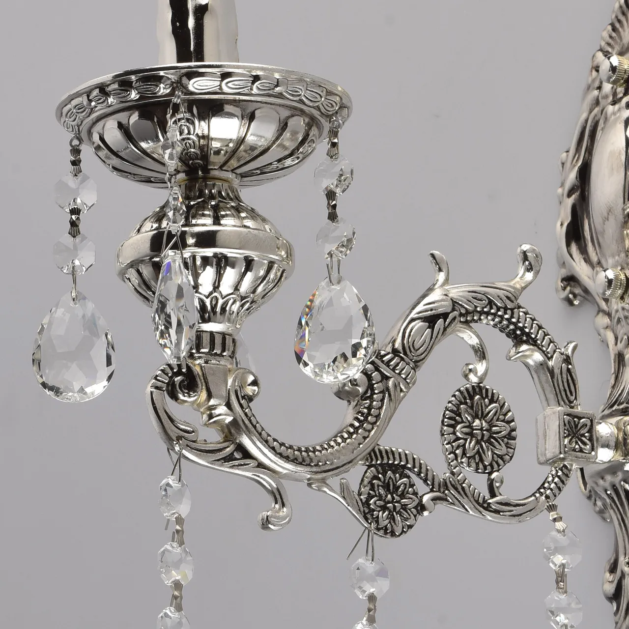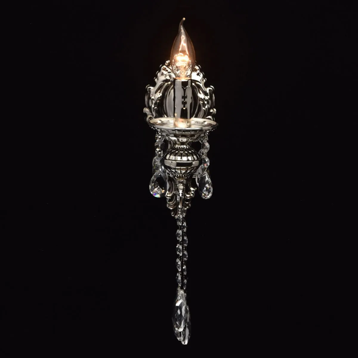Металлическое основание серебряного цвета с патиной. Декор - хрусталь