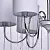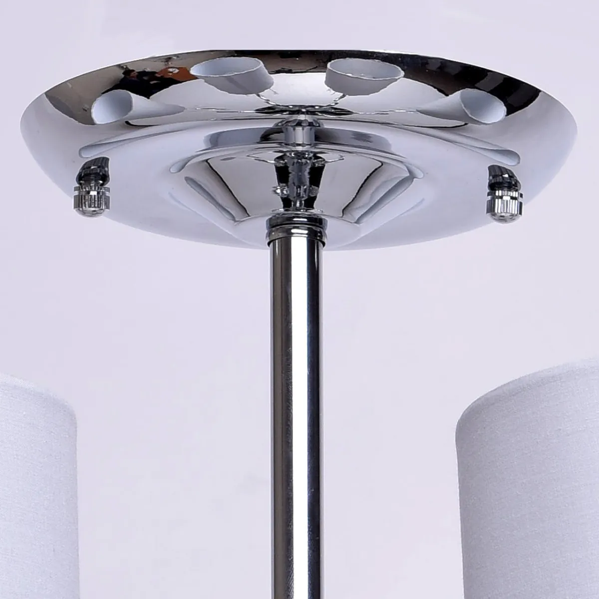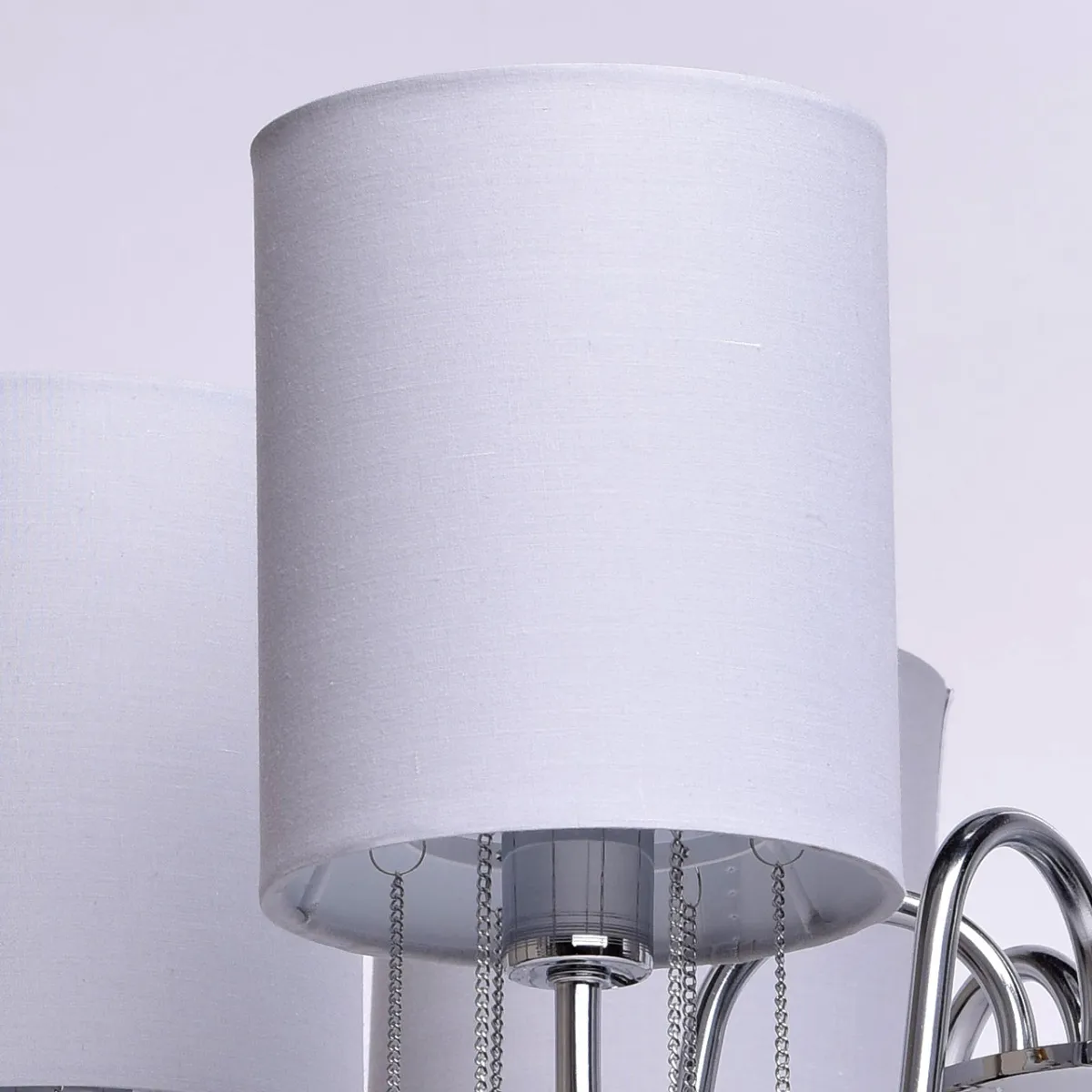 Металлическое основание цвета хрома, текстильные абажуры нежно-серого цвета, декоративные подвески и