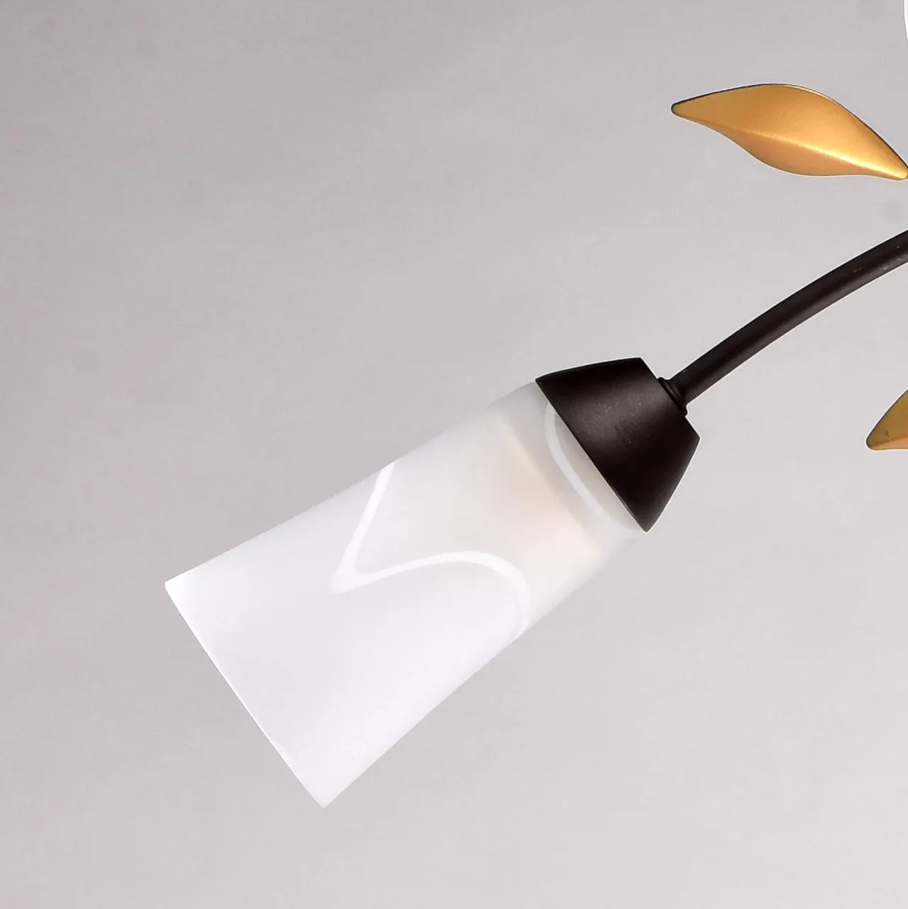 Металлическое основание коричневого цвета. Плафоны: матовое стекло. Декор: металл цвета золота.