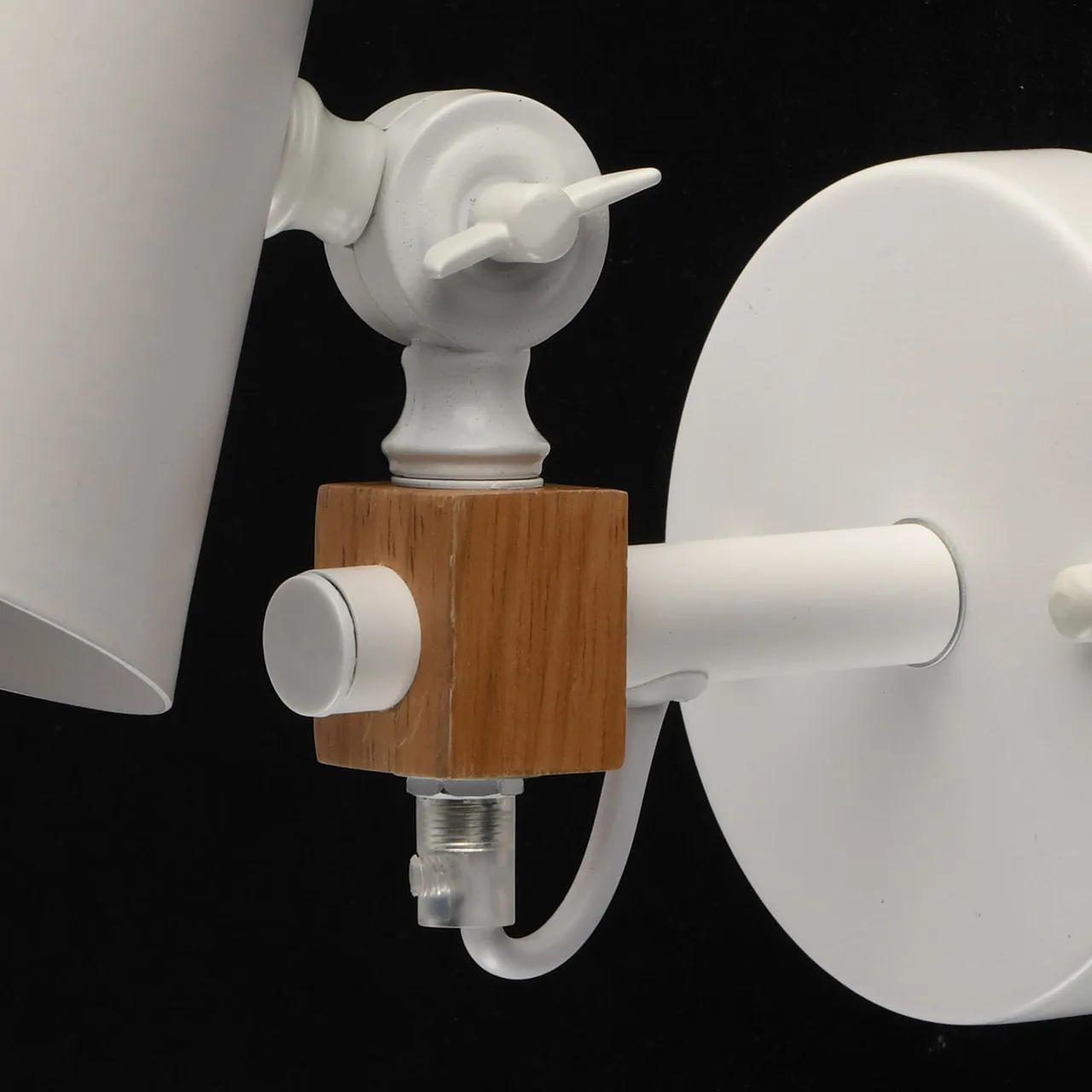 Металлические основание и плафон белого цвета. Декор - дерево гевея.